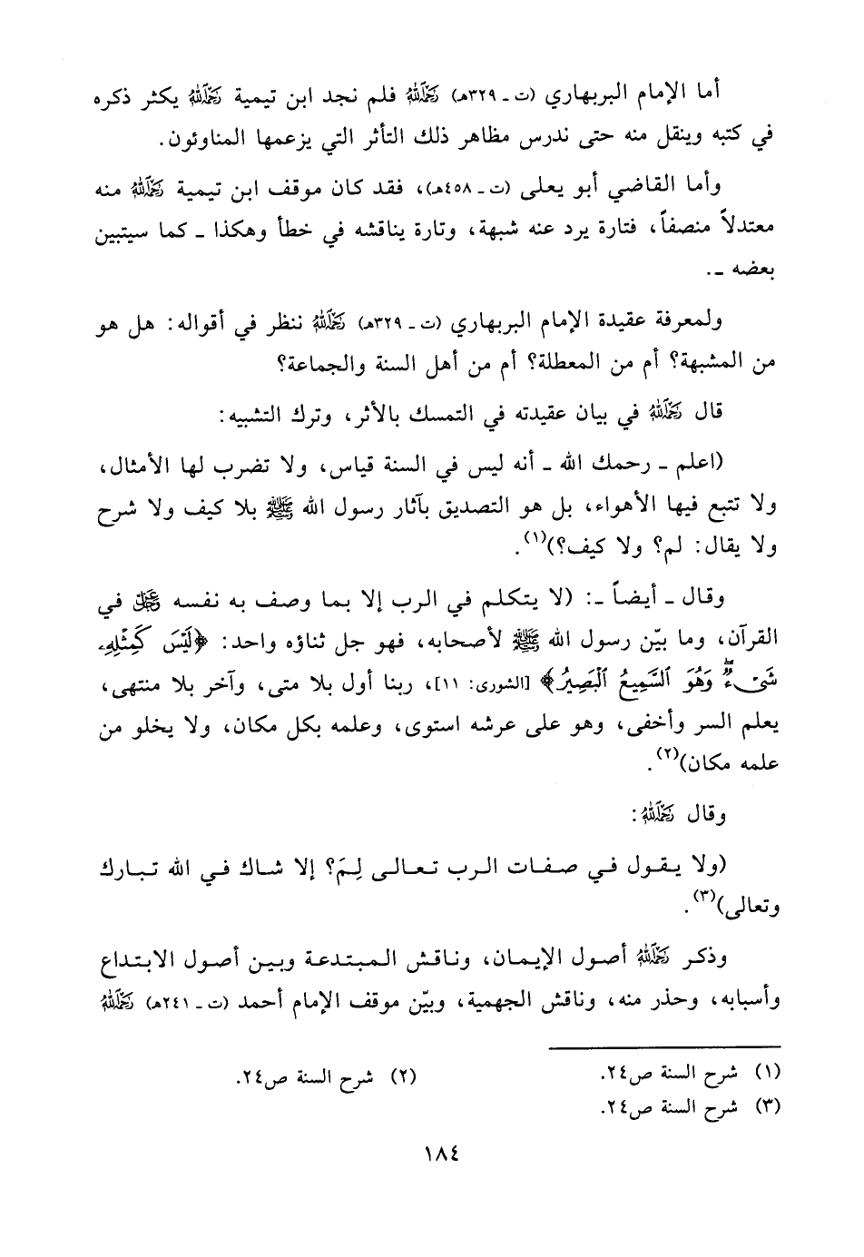 أما الإمام البربهاري (ت - 329هـ) رحمه الله فلم نجد ابن تيمية رحمه الله يكثر ذكره في كتبه وينقل منه حتى ندرس مظاهر ذلك التأثر التي يزعمها المناوئون.