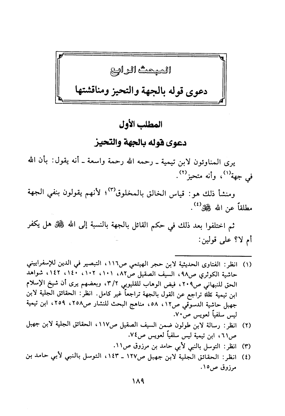 (¬1) انظر: الفتاوى الحديثية لابن حجر الهيتمي ص116، التبصير في الدين للإسفراييني حاشية الكوثري ص98، السيف الصقيل ص82، 101، 102، 140، 142، شواهد الحق للنبهاني ص209، فيض الوهاب للقليوبي 2/3، وبعضهم يرى أن شيخ الإسلام ابن تيمية رحمه الله تراجع عن القول بالجهة تراجعاً غير كامل. انظر: الحقائق الجلية لابن جهبل حاشية الدسوقي ص12، 58، مناهج البحث للنشار ص258، 259، ابن تيمية ليس سلفياً لعويس ص70.