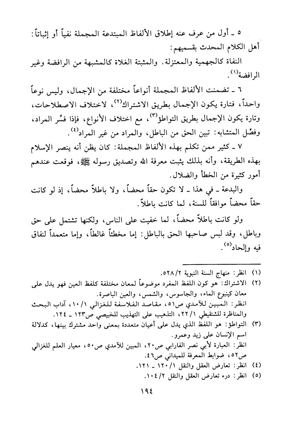 5 - أول من عرف عنه إطلاق الألفاظ المبتدعة المجملة نفياً أو إثباتاً: أهل الكلام المحدث بقسميهم: