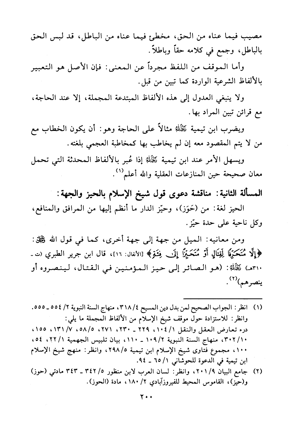 المسألة الثانية: مناقشة دعوى قول شيخ الإسلام بالحيز والجهة:
