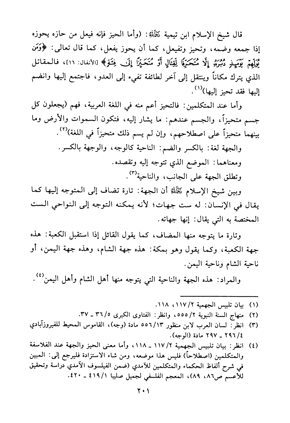 (¬4) انظر: بيان تلبيس الجهمية 2/117 - 118، وأما معنى الحيز والجهة عند الفلاسفة والمتكلمين (اصطلاحاً) فليس هذا موضعه، ومن شاء الاستزادة فليرجع إلى: المبين في شرح ألفاظ الحكماء والمتكلمين للآمدي (ضمن الفيلسوف الآمدي دراسة وتحقيق للأعسم ص86، 89) ، المعجم الفلسفي لجميل صليبا 1/419 - 420.