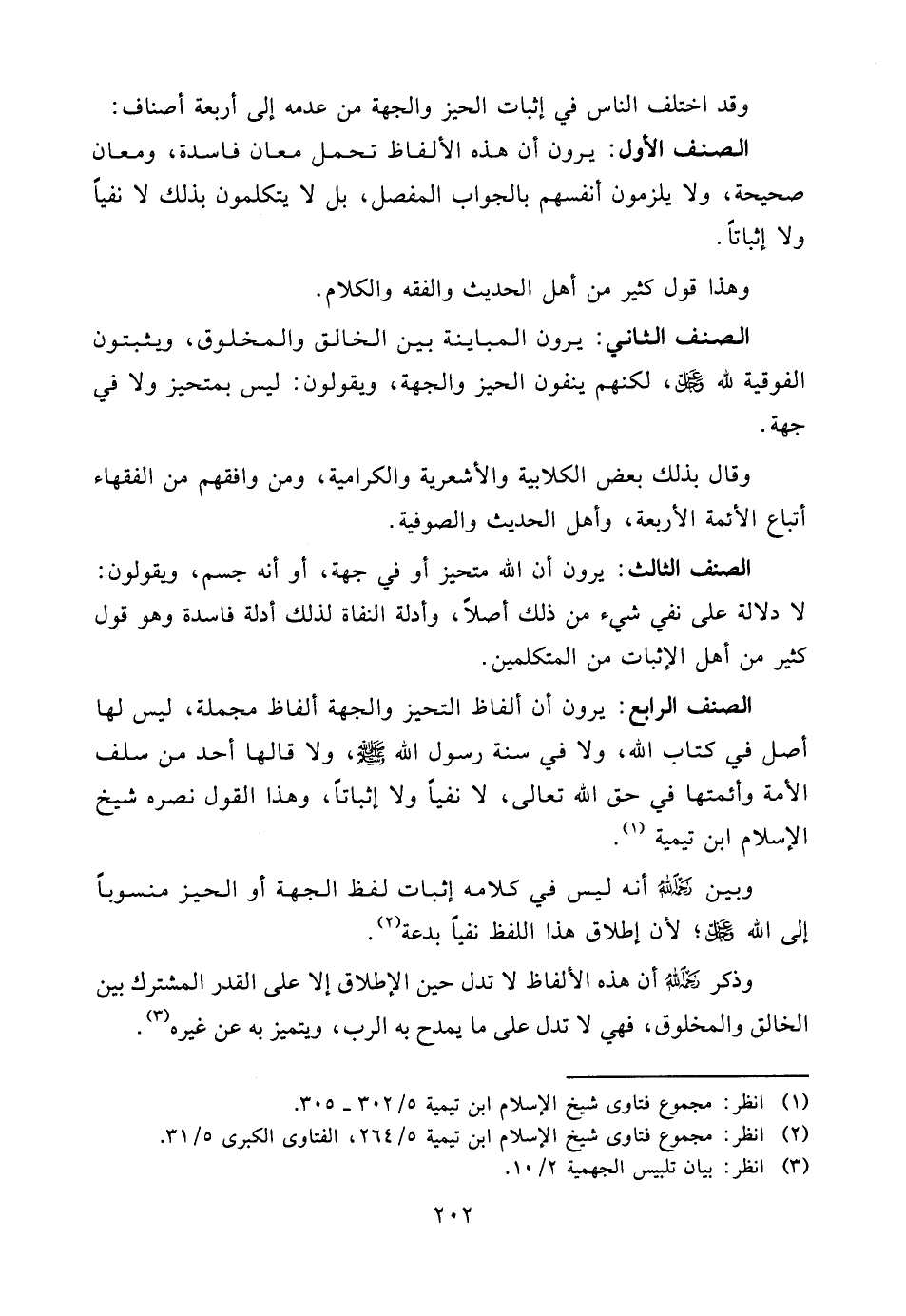 الصنف الرابع: يرون أن ألفاظ التحيز والجهة ألفاظ مجملة، ليس لها أصل في كتاب الله، ولا في سنة رسول الله صلّى الله عليه وسلّم، ولا قالها أحد من سلف الأمة وأئمتها في حق الله تعالى، لا نفياً ولا إثباتاً، وهذا القول نصره شيخ الإسلام ابن تيمية (¬1) .