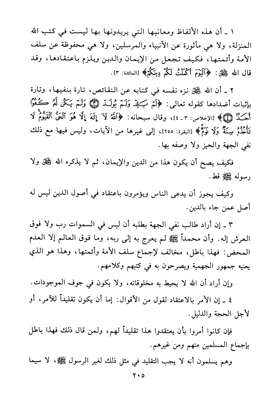 1 - أن هذه الألفاظ ومعانيها التي يريدونها بها ليست في كتب الله المنزلة، ولا هي مأثورة عن الأنبياء والمرسلين، ولا هي محفوظة عن سلف الأمة وأئمتها، فكيف تجعل من الإيمان والدين ويلزم باعتقادها، وقد قال الله عزّ وجل: {الْيَوْمَ أَكْمَلْتُ لَكُمْ دِينَكُمْ} [المائدة:3]