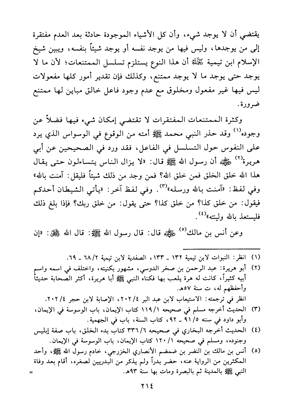 وكثرة الممتنعات المفتقرات لا تقتضي إمكان شيء فيها فضلاً عن وجوده (¬1) وقد حذر النبي محمد صلّى الله عليه وسلّم أمته من الوقوع في الوسواس الذي يرد على النفوس حول التسلسل في الفاعل، فقد ورد في الصحيحين عن أبي هريرة (¬2)