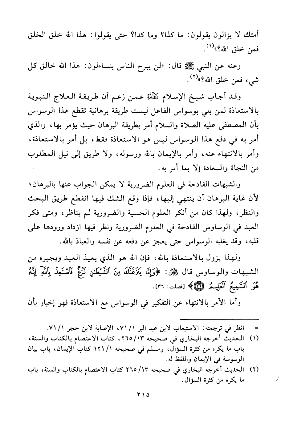وقد أجاب شيخ الإسلام رحمه الله عمن زعم أن طريقة العلاج النبوية بالاستعاذة لمن بلي بوسواس الفاعل ليست طريقة برهانية تقطع هذا الوسواس بأن المصطفى عليه الصلاة والسلام أمر بطريقة البرهان حيث يؤمر بها، والذي أمر به في دفع هذا الوسواس ليس هو الاستعاذة فقط، بل أمر بالاستعاذة، وأمر بالانتهاء عنه، وأمر بالإيمان بالله ورسوله، ولا طريق إلى نيل المطلوب من النجاة والسعادة إلا بما أمر به.