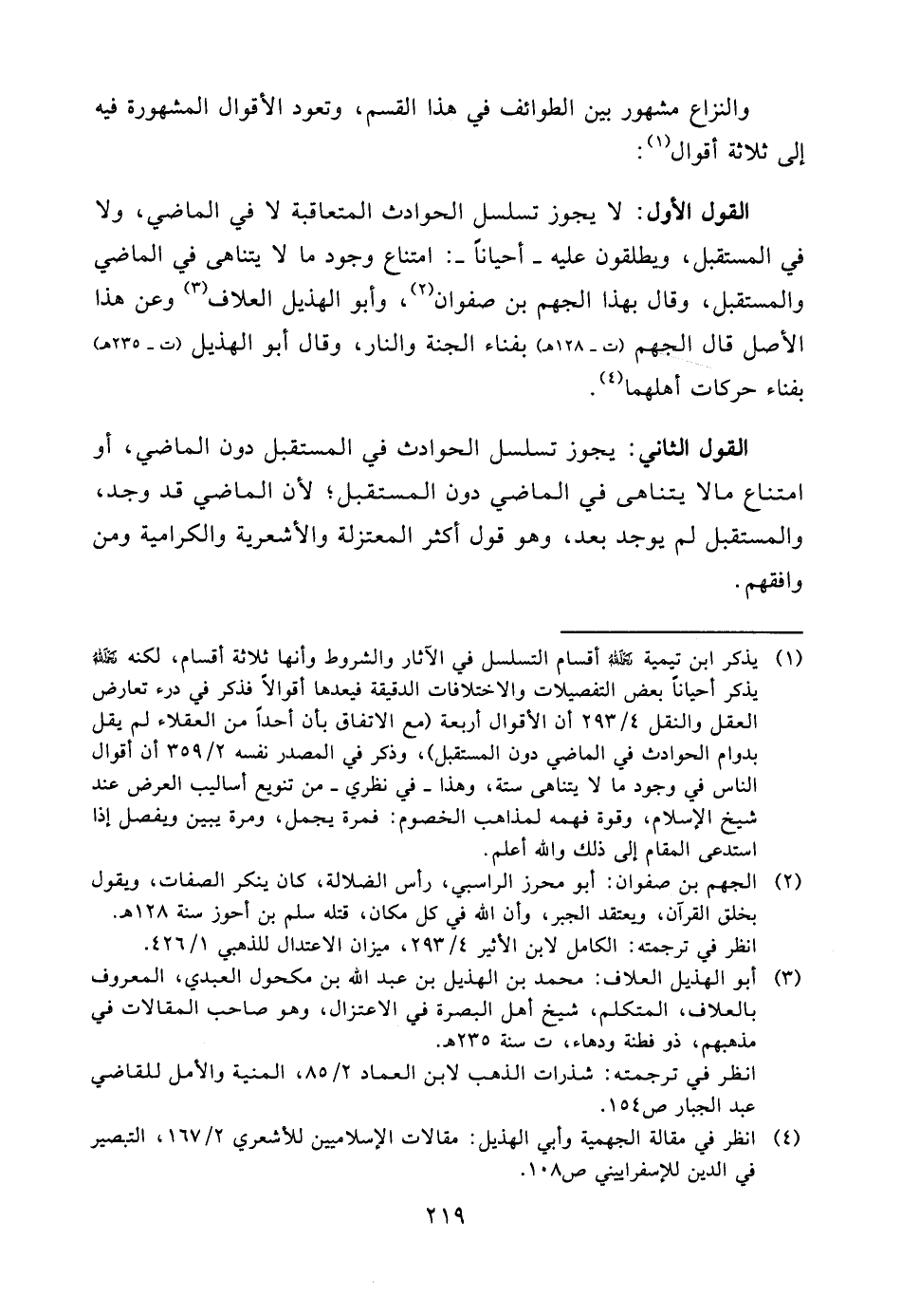 القول الأول: لا يجوز تسلسل الحوادث المتعاقبة لا في الماضي، ولا في المستقبل، ويطلقون عليه - أحياناً -: امتناع وجود ما لا يتناهى في الماضي والمستقبل، وقال بهذا الجهم بن صفوان (¬2) ،