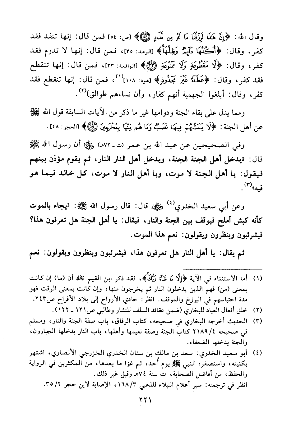 (¬1) أما الاستثناء في الآية {إلا ما شآء ربك} ، فقد ذكر ابن القيم رحمه الله أن (ما) إن كانت بمعنى (من) فهم الذين يدخلون النار ثم يخرجون منها، وإن كانت بمعنى الوقت فهو مدة احتباسهم في البرزخ والموقف. انظر: حادي الأرواح إلى بلاد الأفراح ص243.