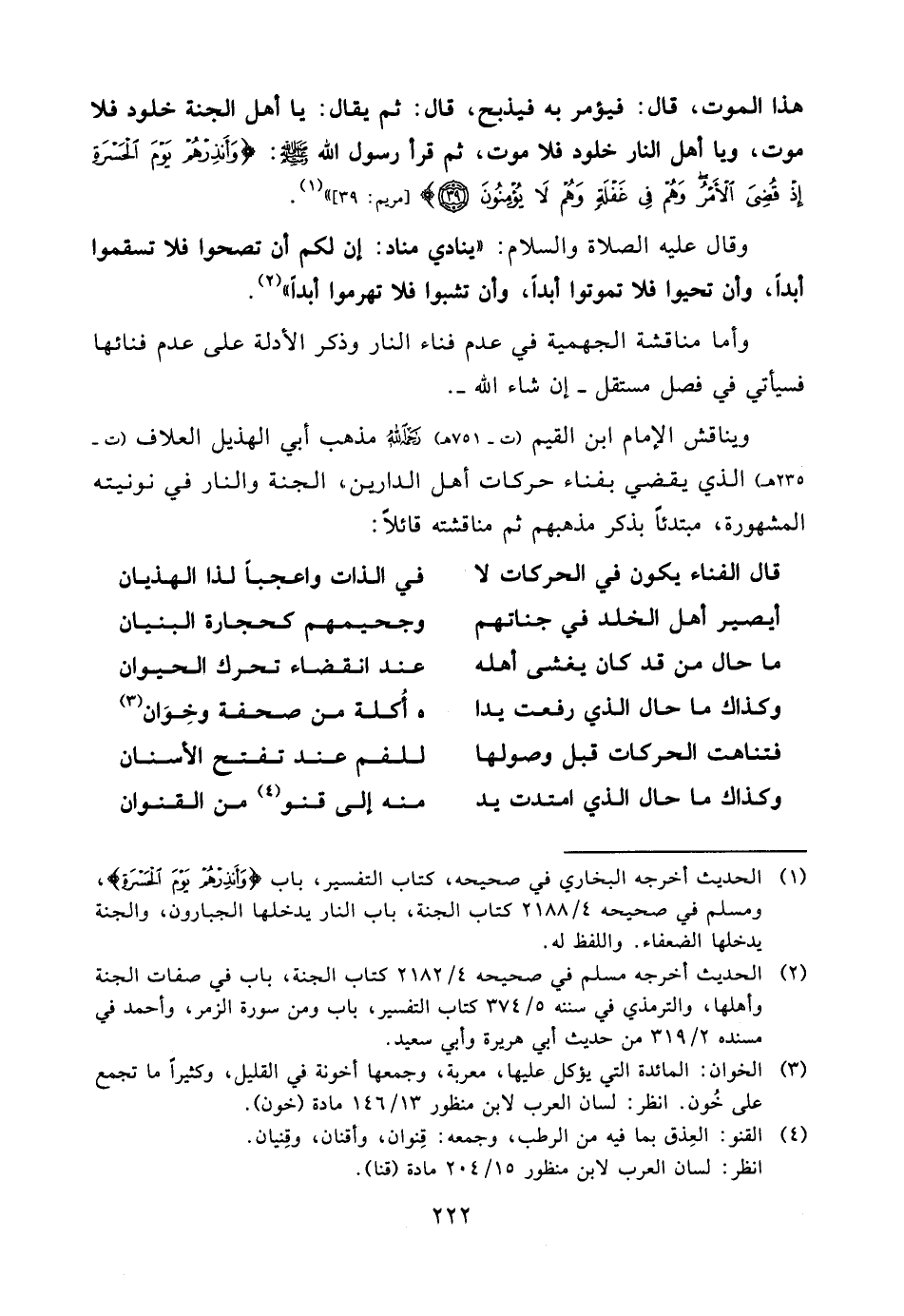 ويناقش الإمام ابن القيم (ت - 751هـ) رحمه الله مذهب أبي الهذيل العلاف (ت - 235هـ) الذي يقضي بفناء حركات أهل الدارين، الجنة والنار في نونيته المشهورة، مبتدئاً بذكر مذهبهم ثم مناقشته قائلاً: