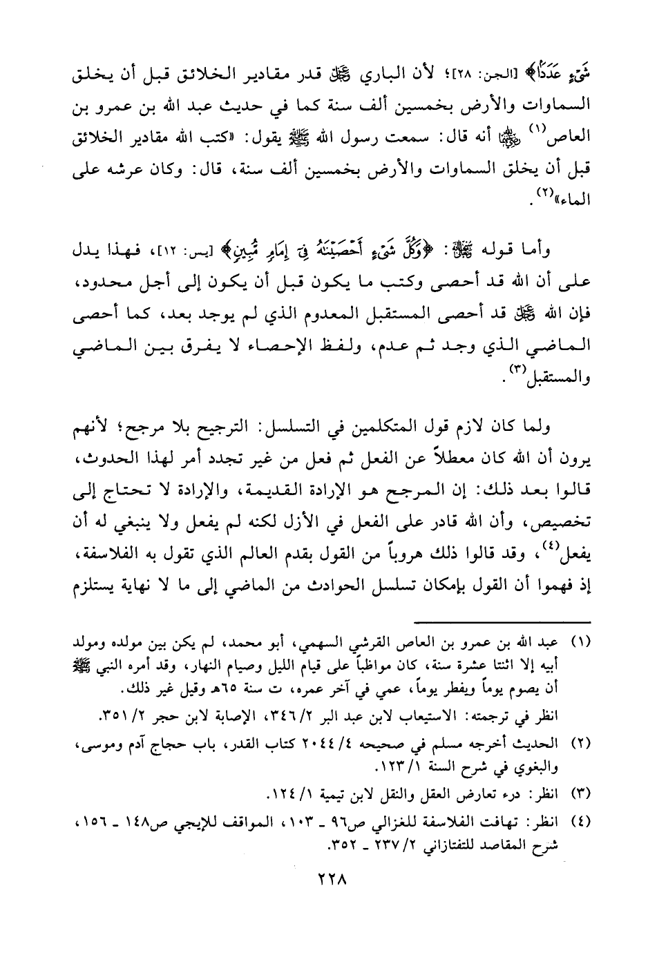 (¬4) انظر: تهافت الفلاسفة للغزالي ص96 - 103، المواقف للإيجي ص148 - 156، شرح المقاصد للتفتازاني 2/237 - 352.