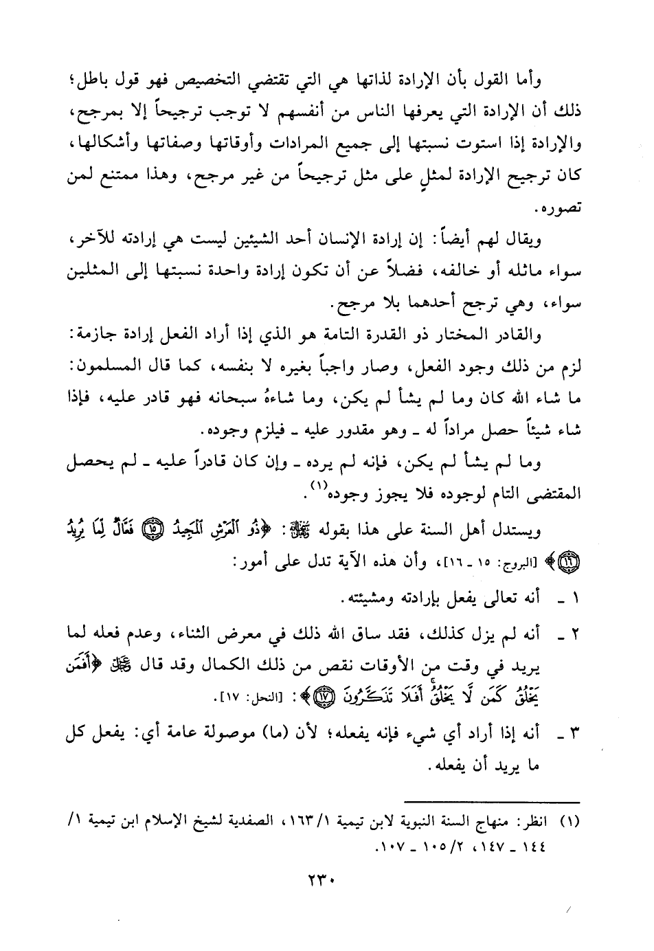 ويستدل أهل السنة على هذا بقوله سبحانه وتعالى: {ذُو الْعَرْشِ الْمَجِيدُ * فَعَّالٌ لِّمَا يُرِيدُ} [البروج: 15 - 16] ، وأن هذه الآية تدل على أمور: