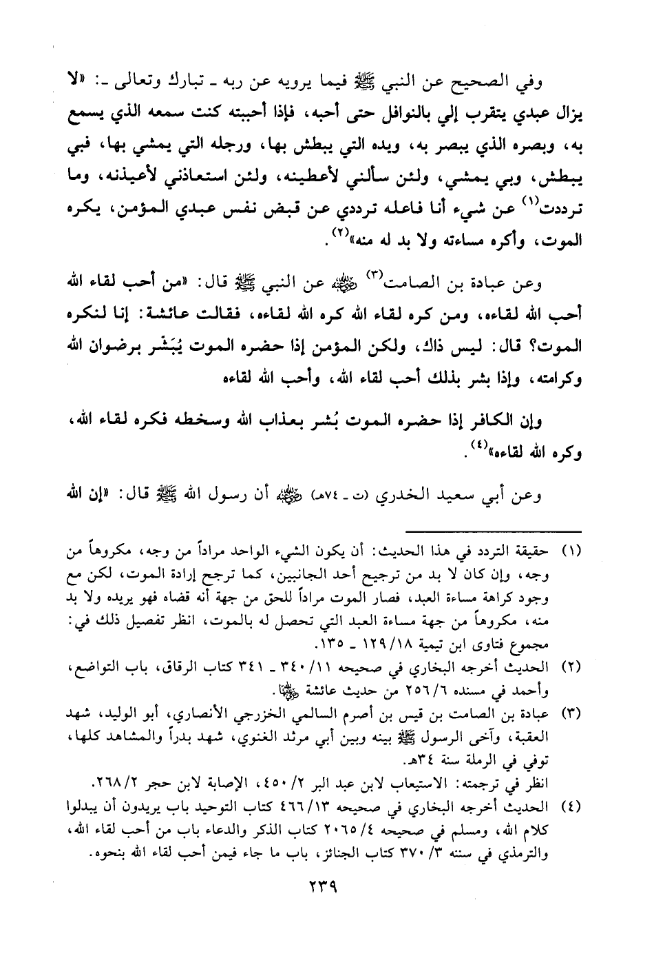 (¬4) الحديث أخرجه البخاري في صحيحه 13/466 كتاب التوحيد باب يريدون أن يبدلوا كلام الله، ومسلم في صحيحه 4/2065 كتاب الذكر والدعاء باب من أحب لقاء الله، والترمذي في سننه 3/370 كتاب الجنائز، باب ما جاء فيمن أحب لقاء الله بنحوه.