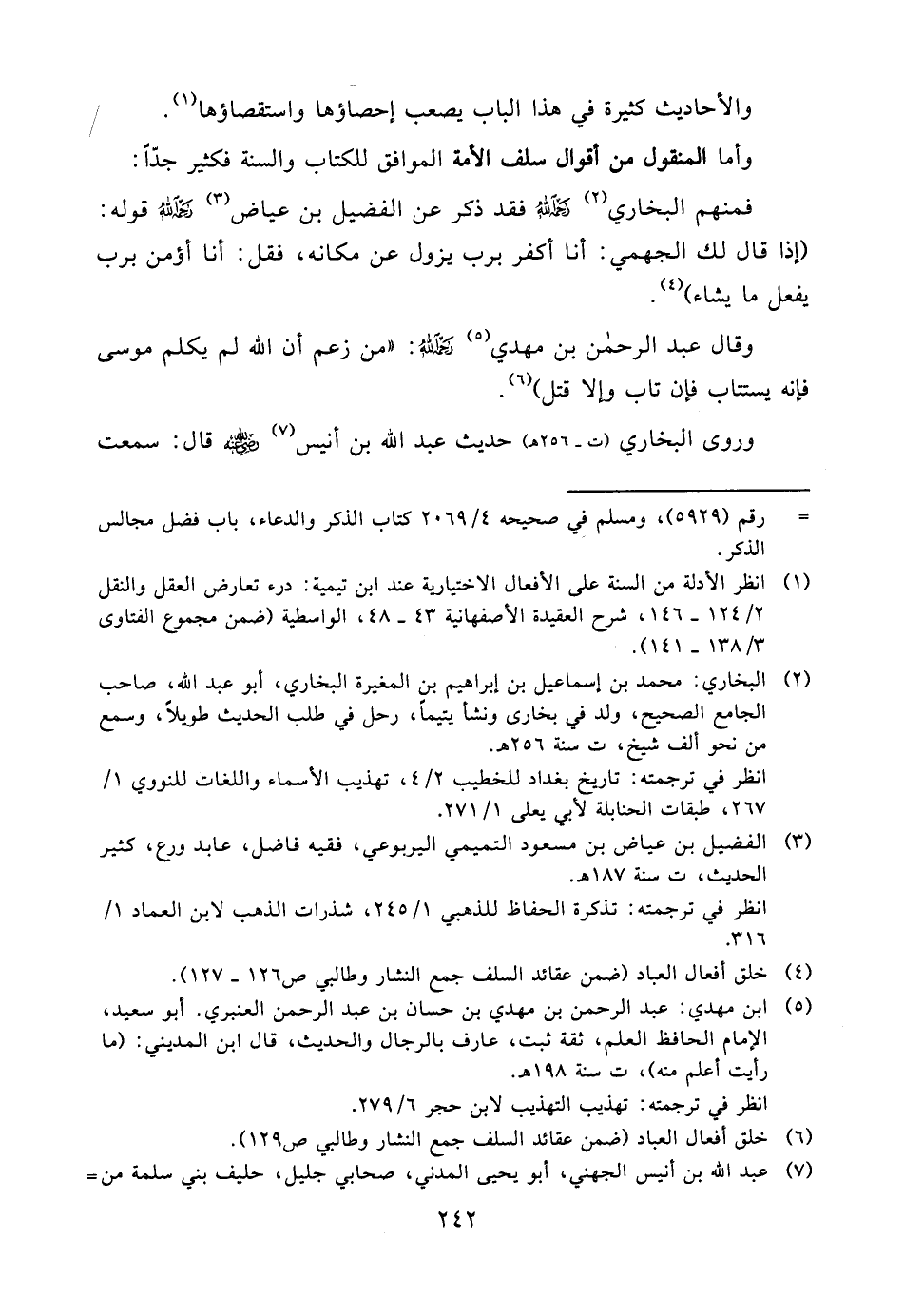 فمنهم البخاري (¬2) رحمه الله فقد ذكر عن الفضيل بن عياض (¬3) رحمه الله قوله: (إذا قال لك الجهمي: أنا أكفر برب يزول عن مكانه، فقل: أنا أؤمن برب يفعل ما يشاء) (¬4) .