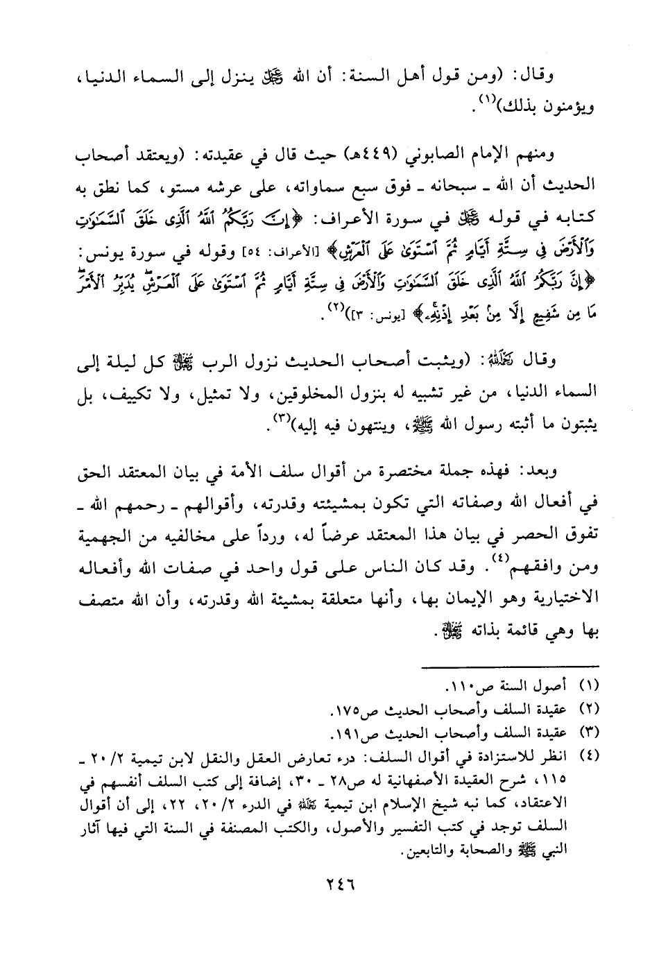 (¬4) انظر للاستزادة في أقوال السلف: درء تعارض العقل والنقل لابن تيمية 2/20 - 115، شرح العقيدة الأصفهانية له ص28 - 30، إضافة إلى كتب السلف أنفسهم في الاعتقاد، كما نبه شيخ الإسلام ابن تيمية رحمه الله في الدرء 2/20، 22، إلى أن أقوال السلف توجد في كتب التفسير والأصول، والكتب المصنفة في السنة التي فيها آثار النبي صلّى الله عليه وسلّم والصحابة والتابعين.