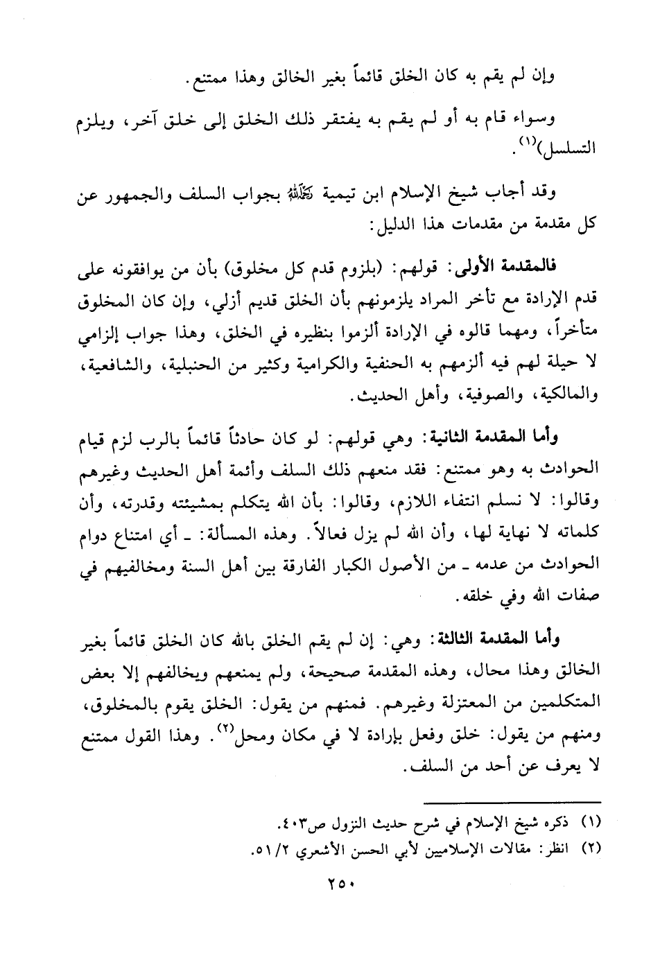 وأما المقدمة الثانية: وهي قولهم: لو كان حادثاً قائماً بالرب لزم قيام الحوادث به وهو ممتنع: فقد منعهم ذلك السلف وأئمة أهل الحديث وغيرهم وقالوا: لا نسلم انتفاء اللازم، وقالوا: بأن الله يتكلم بمشيئته وقدرته، وأن كلماته لا نهاية لها، وأن الله لم يزل فعالاً. وهذه المسألة: - أي امتناع دوام الحوادث من عدمه - من الأصول الكبار الفارقة بين أهل السنة ومخالفيهم في صفات الله وفي خلقه.