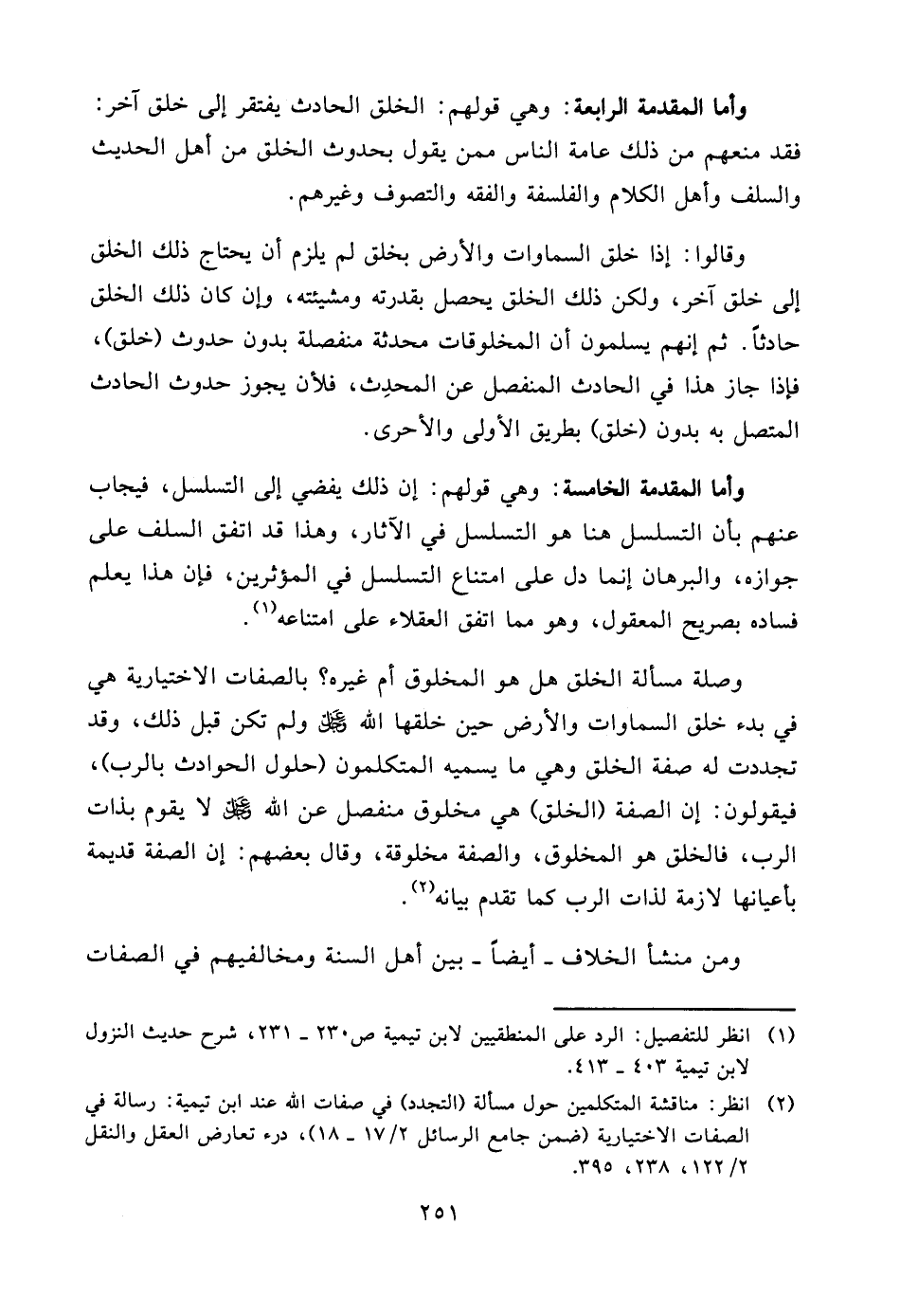(¬2) انظر: مناقشة المتكلمين حول مسألة (التجدد) في صفات الله عند ابن تيمية: رسالة في الصفات الاختيارية (ضمن جامع الرسائل 2/17 - 18) ، درء تعارض العقل والنقل 2/122، 238، 395.