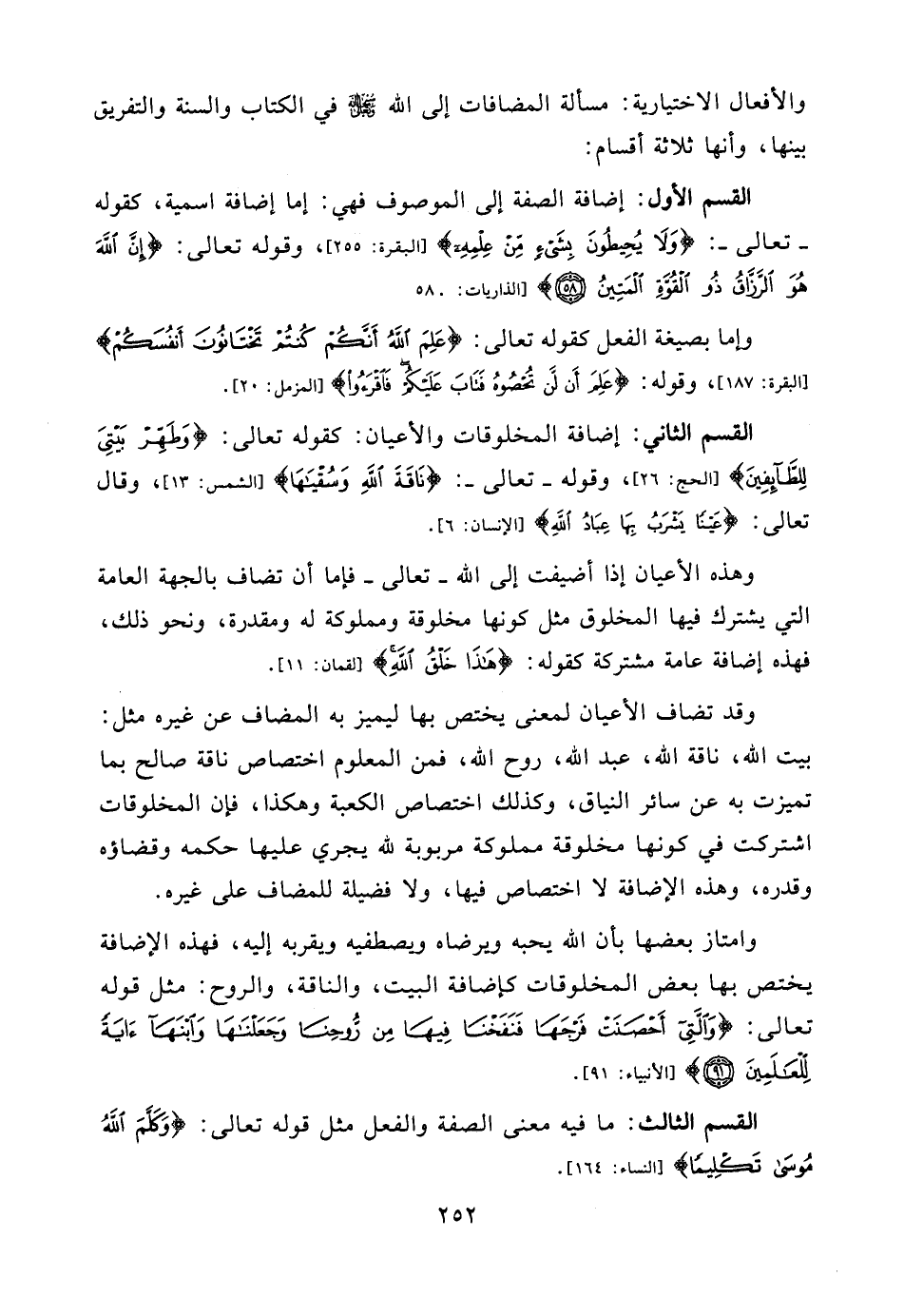 والأفعال الاختيارية: مسألة المضافات إلى الله سبحانه وتعالى في الكتاب والسنة والتفريق بينها، وأنها ثلاثة أقسام: