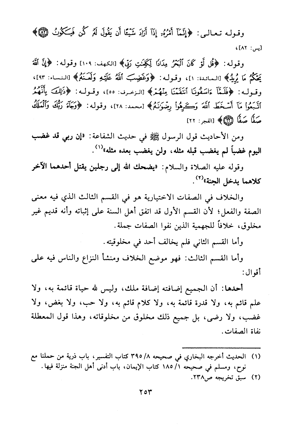 وقوله: {قُلْ لَوْ كَانَ الْبَحْرُ مِدَاداً لِكَلِمَاتِ رَبِّي} [الكهف: 109] وقوله: {إِنَّ اللَّهَ يَحْكُمُ مَا يُرِيدُ} [المائدة: 1] ، وقوله: {وَغَضِبَ اللَّهُ عَلَيْهِ وَلَعَنَهُ} [النساء: 93] ، وقوله: {فَلَمَّا آسَفُونَا انْتَقَمْنَا مِنْهُمْ} [الزخرف: 55] ، وقوله: {ذَلِكَ بِأَنَّهُمُ اتَّبَعُوا مَا أَسْخَطَ اللَّهَ وَكَرِهُوا رِضْوَانَهُ} [محمد: 28] ، وقوله: {وَجَاءَ رَبُّكَ وَالْمَلَكُ صَفّاً صَفّاً} [الفجر: 22]