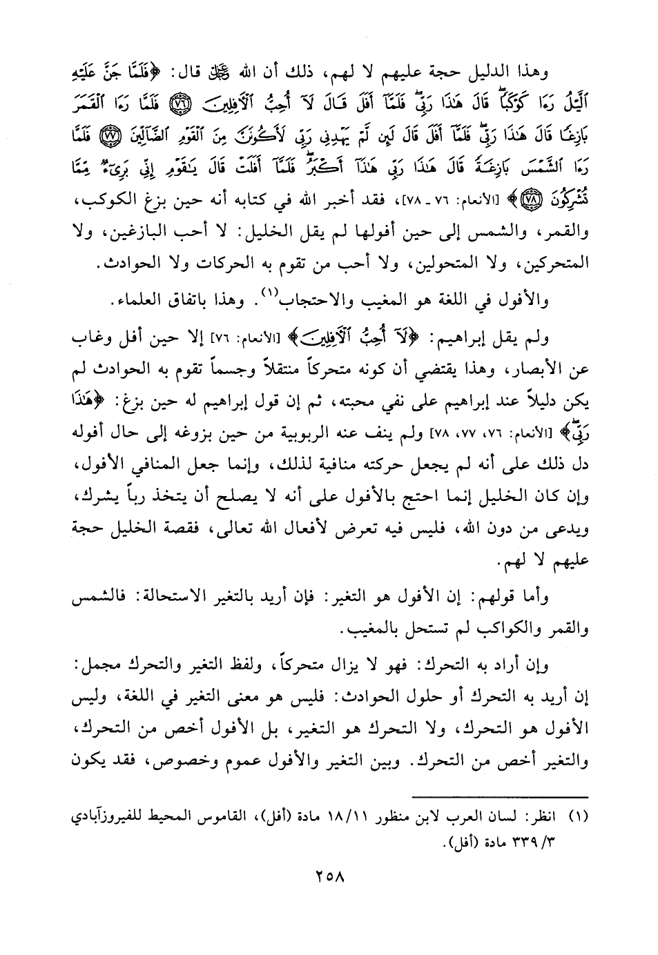 وإن أراد به التحرك: فهو لا يزال متحركاً، ولفظ التغير والتحرك مجمل: إن أريد به التحرك أو حلول الحوادث: فليس هو معنى التغير في اللغة، وليس الأفول هو التحرك، ولا التحرك هو التغير، بل الأفول أخص من التحرك، والتغير أخص من التحرك. وبين التغير والأفول عموم وخصوص، فقد يكون