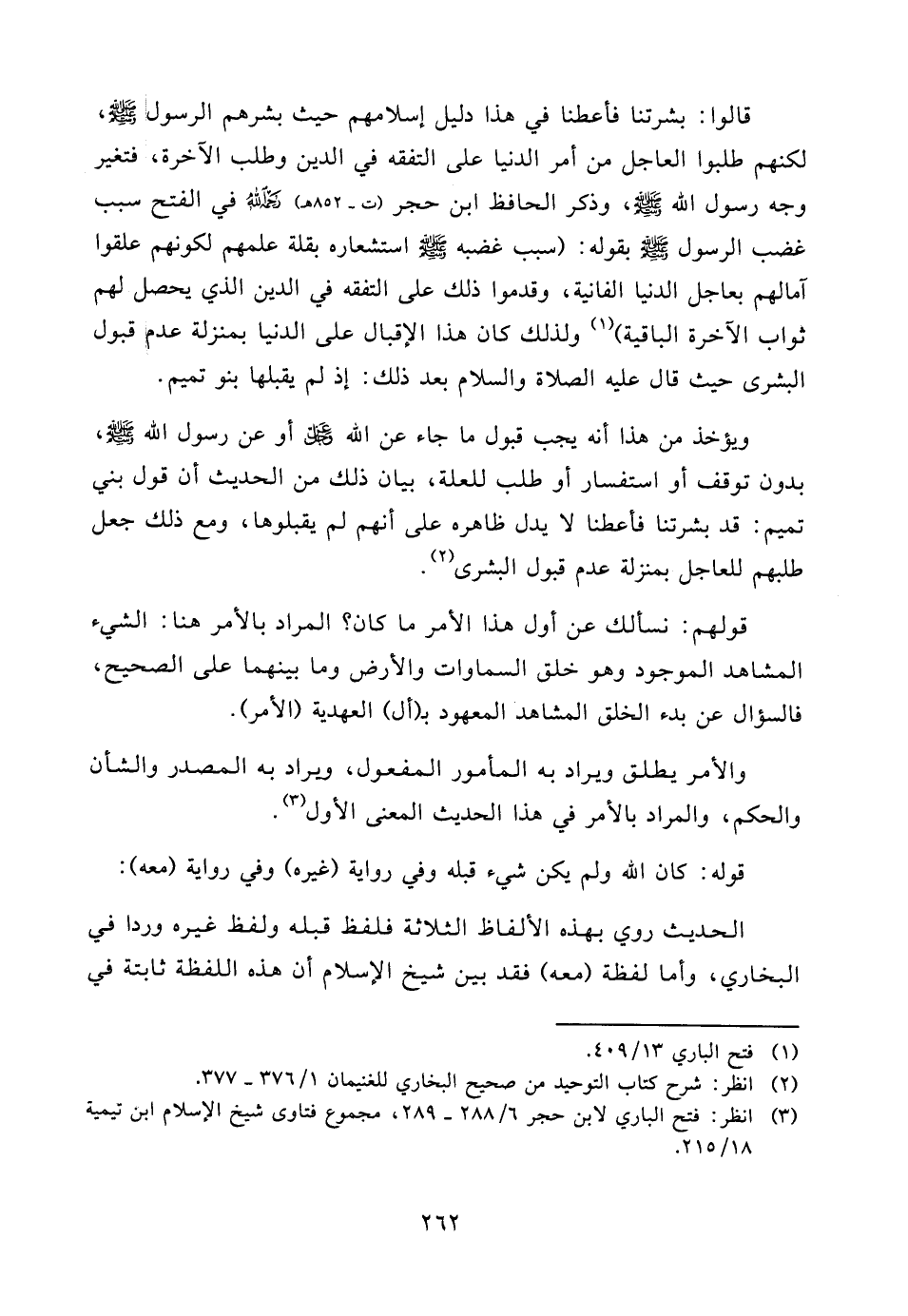 قالوا: بشرتنا فأعطنا في هذا دليل إسلامهم حيث بشرهم الرسول صلّى الله عليه وسلّم، لكنهم طلبوا العاجل من أمر الدنيا على التفقه في الدين وطلب الآخرة، فتغير وجه رسول الله صلّى الله عليه وسلّم، وذكر الحافظ ابن حجر (ت - 852هـ) رحمه الله في الفتح سبب غضب الرسول صلّى الله عليه وسلّم بقوله: (سبب غضبه صلّى الله عليه وسلّم استشعاره بقلة علمهم لكونهم علقوا آمالهم بعاجل الدنيا الفانية، وقدموا ذلك على التفقه في الدين الذي يحصل لهم ثواب الآخرة الباقية) (¬1) ولذلك كان هذا الإقبال على الدنيا بمنزلة عدم قبول البشرى حيث قال عليه الصلاة والسلام بعد ذلك: إذ لم يقبلها بنو تميم.