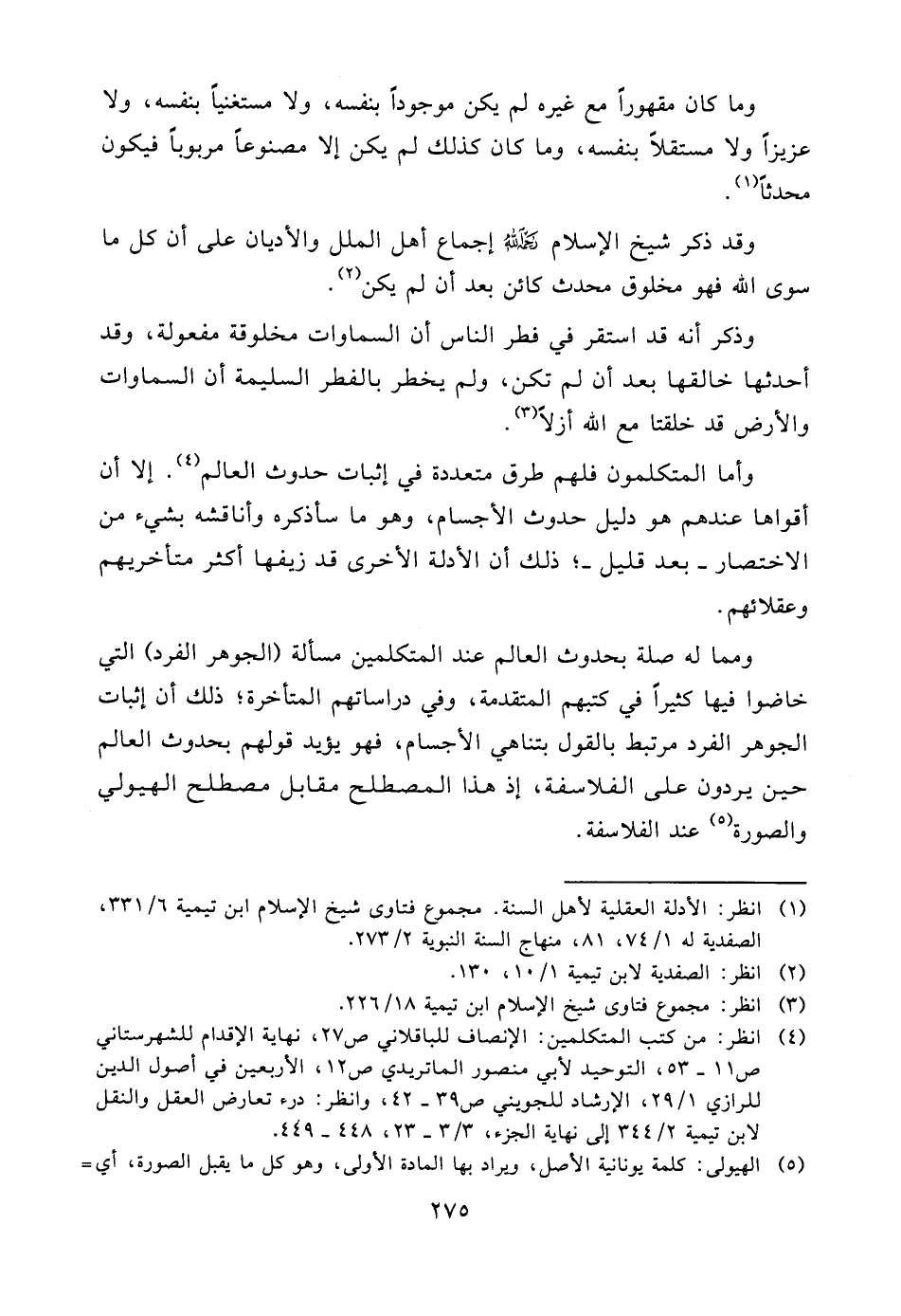 (¬1) انظر: الأدلة العقلية لأهل السنة. مجموع فتاوى شيخ الإسلام ابن تيمية 6/331، الصفدية له 1/74، 81، منهاج السنة النبوية 2/273.