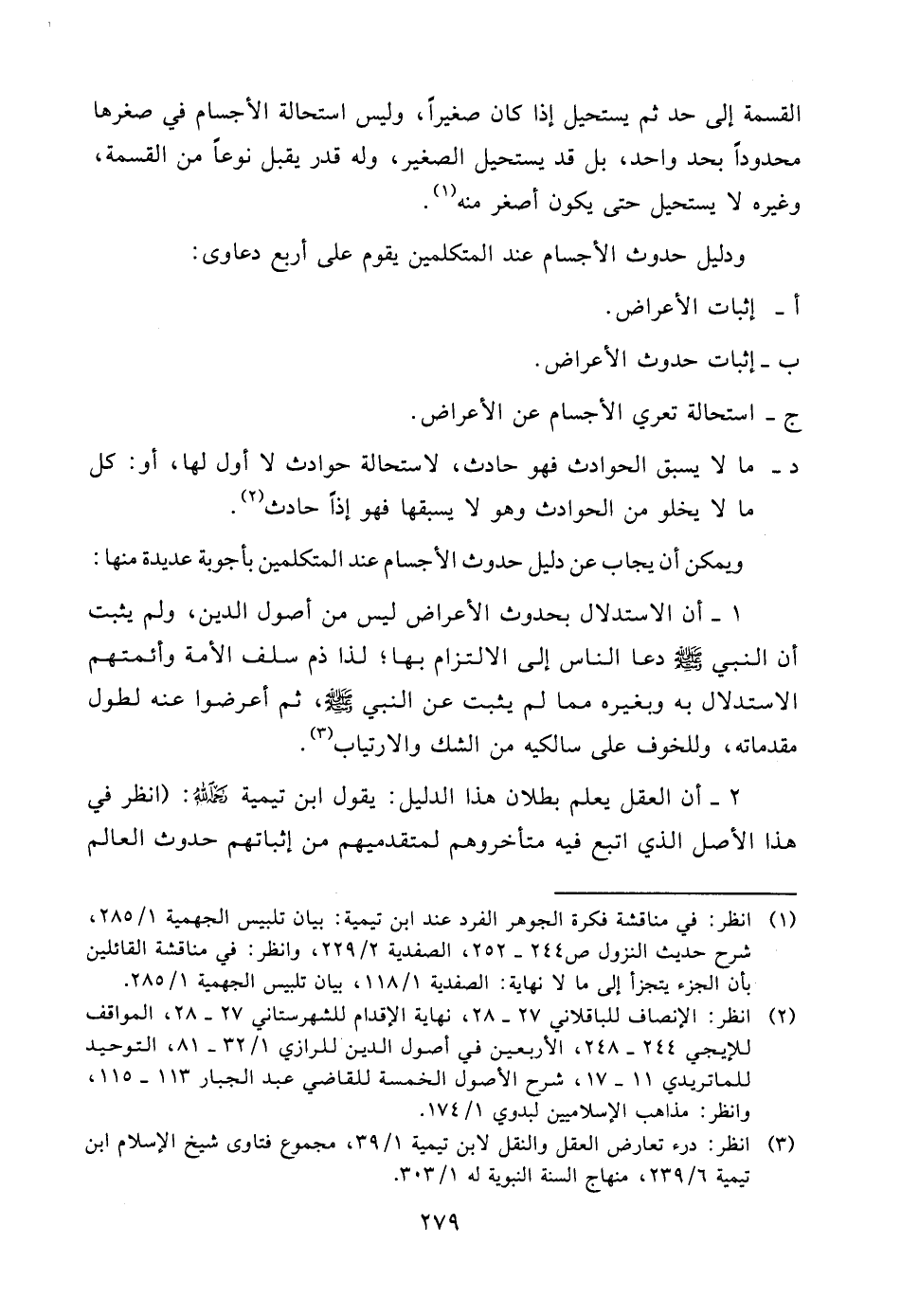 (¬1) انظر: في مناقشة فكرة الجوهر الفرد عند ابن تيمية: بيان تلبيس الجهمية 1/285، شرح حديث النزول ص244 - 252، الصفدية 2/229، وانظر: في مناقشة القائلين بأن الجزء يتجزأ إلى ما لا نهاية: الصفدية 1/118، بيان تلبيس الجهمية 1/285.