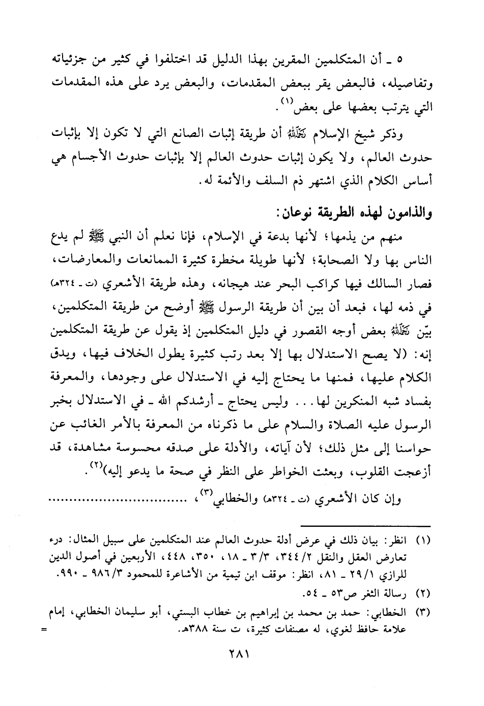 (¬1) انظر: بيان ذلك في عرض أدلة حدوث العالم عند المتكلمين على سبيل المثال: درء تعارض العقل والنقل 2/344، 3/3 - 18، 350، 448، الأربعين في أصول الدين للرازي 1/29 - 81، انظر: موقف ابن تيمية من الأشاعرة للمحمود 3/986 - 990.