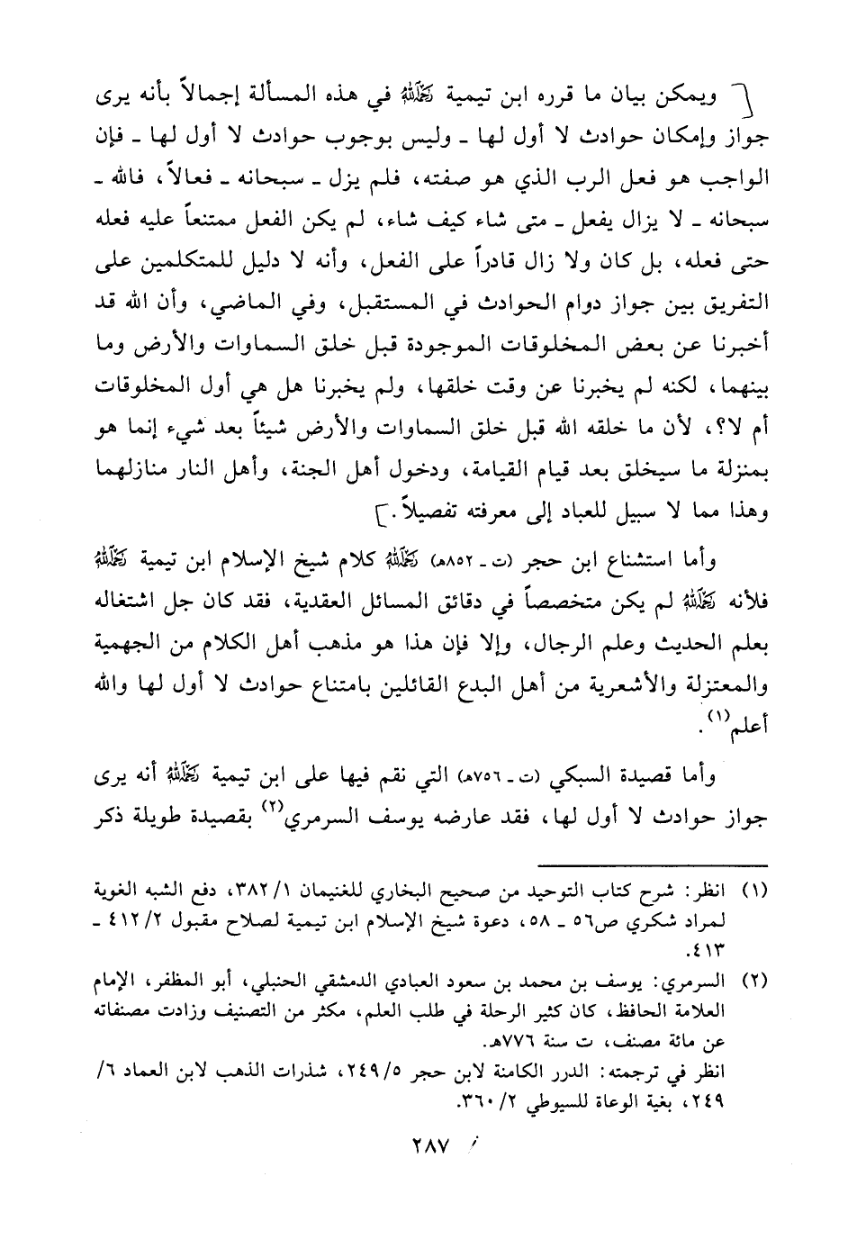 وأما استشناع ابن حجر (ت - 852هـ) رحمه الله كلام شيخ الإسلام ابن تيمية رحمه الله فلأنه رحمه الله لم يكن متخصصاً في دقائق المسائل العقدية، فقد كان جل اشتغاله بعلم الحديث وعلم الرجال، وإلا فإن هذا هو مذهب أهل الكلام من الجهمية والمعتزلة والأشعرية من أهل البدع القائلين بامتناع حوادث لا أول لها والله أعلم (¬1) .