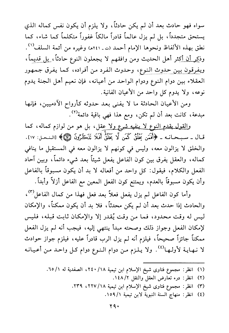 والقول بقدم النوع لا ينفيه شرع ولا عقل، بل هو من لوازم كماله، كما قال - سبحانه - {أَفَمَنْ يَخْلُقُ كَمَنْ لا يَخْلُقُ أَفَلا تَذَكَّرُونَ} [النحل: 17] . والخلق لا يزالون معه، وليس في كونهم لا يزالون معه في المستقبل ما ينافي كماله، والعقل يفرق بين كون الفاعل يفعل شيئاً بعد شيء دائماً، وبين آحاد الفعل والكلام، فيقول: كل واحد من أفعاله لا بد أن يكون مسبوقاً بالفاعل وأن يكون مسبوقاً بالعدم، ويمتنع كون الفعل المعين مع الفاعل أزلاً وأبداً.