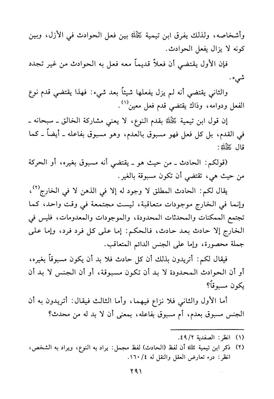 (¬2) ذكر ابن تيمية رحمه الله أن لفظ (الحادث) لفظ مجمل: يراد به النوع، ويراد به الشخص، انظر: درء تعارض العقل والنقل له 4/160.