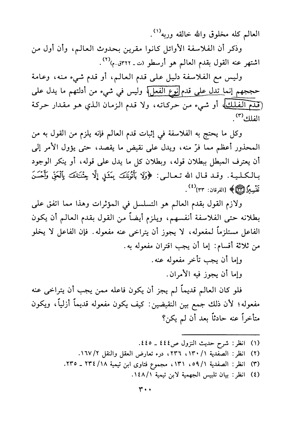 وكل ما يحتج به الفلاسفة في إثبات قدم العالم فإنه يلزم من القول به من المحذور أعظم مما فرّ منه، ويدل على نقيض ما يقصد، حتى يؤول الأمر إلى أن يعترف المبطل ببطلان قوله، وبطلان كل ما يدل على قوله، أو ينكر الوجود بالكلية. وقد قال الله تعالى: {وَلا يَأْتُونَكَ بِمَثَلٍ إِلَّا جِئْنَاكَ بِالْحَقِّ وَأَحْسَنَ تَفْسِيراً} [الفرقان: 33] (¬4) .
