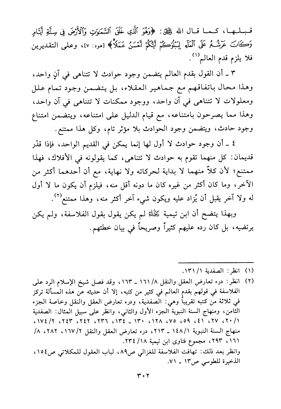 (¬2) انظر: درء تعارض العقل والنقل 8/161 - 163، وقد فصل شيخ الإسلام الرد على الفلاسفة في قولهم بقدم العالم في كثير من كتبه، إلا أن حديثه عن هذه المسألة تركز في ثلاثة من كتبه تقريباً وهي: الصفدية، ودرء تعارض العقل والنقل وخاصة الجزء الثامن، ومنهاج السنة النبوية الجزء الأول والثاني، وانظر على سبيل المثال: الصفدية 1/20، 27، 41، 59، 75، 128، 130 - 134، 236، 242، 243، 2/174، منهاج السنة النبوية 1/148 - 213، درء تعارض العقل والنقل 2/167، 282، 8/161، 293، مجموع فتاوى ابن تيمية 18/234.