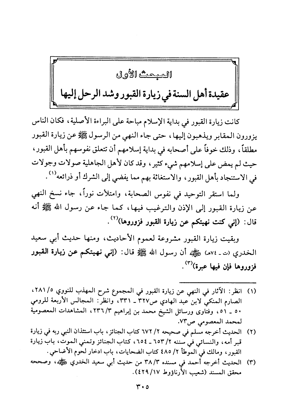 (¬1) انظر: الآثار في النهي عن زيارة القبور في المجموع شرح المهذب للنووي 5/281، الصارم المنكي لابن عبد الهادي ص327 - 331، وانظر: المجالس الأربعة للرومي 50 - 51، وفتاوى ورسائل الشيخ محمد بن إبراهيم 3/236، المشاهدات المعصومية لمحمد المعصومي ص73.