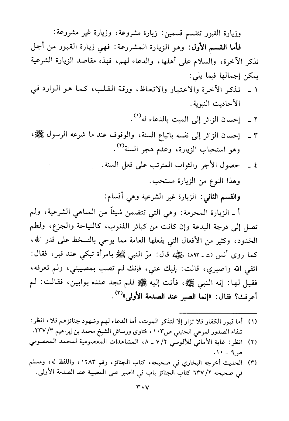 (¬1) أما قبور الكفار فلا تزار إلا لتذكر الموت، أما الدعاء لهم وشهود جنائزهم فلا، انظر: شفاء الصدور لمرعي الحنبلي ص103، فتاوى ورسائل الشيخ محمد بن إبراهيم 3/237.