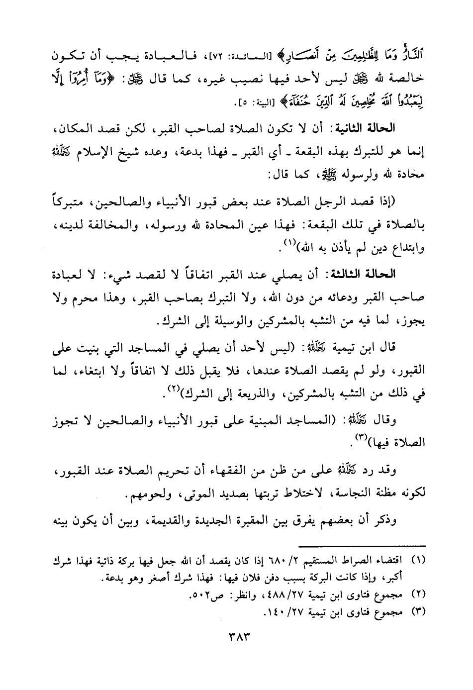 وقال رحمه الله: (المساجد المبنية على قبور الأنبياء والصالحين لا تجوز الصلاة فيها) (¬3)
