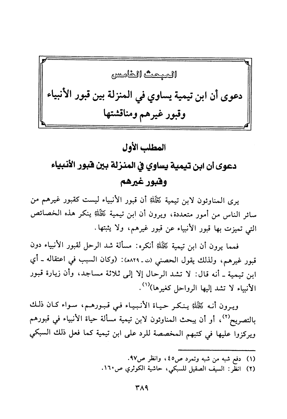 فمما يرون أن ابن تيمية رحمه الله أنكره: مسألة شد الرحل لقبور الأنبياء دون قبور غيرهم، ولذلك يقول الحصني (ت - 829هـ) : (وكان السبب في اعتقاله - أي ابن تيمية - أنه قال: لا تشد الرحال إلا إلى ثلاثة مساجد، وأن زيارة قبور الأنبياء لا تشد إليها الرواحل كغيرها) (¬1) .