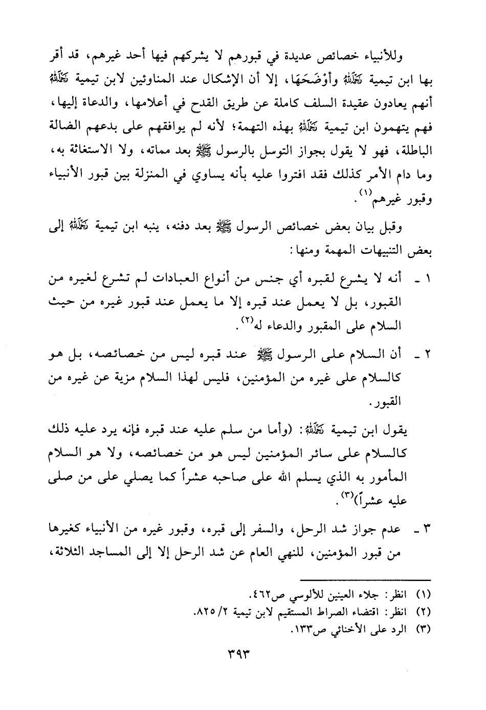 وقبل بيان بعض خصائص الرسول صلّى الله عليه وسلّم بعد دفنه، ينبه ابن تيمية رحمه الله إلى بعض التنبيهات المهمة ومنها: