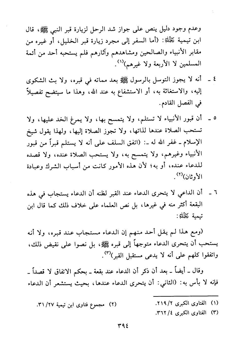 4 - أنه لا يجوز التوسل بالرسول صلّى الله عليه وسلّم بعد مماته في قبره، ولا بث الشكوى إليه، والاستغاثة به، أو الاستشفاع به عند الله، وهذا ما سيتضح تفصيلاً في الفصل القادم.