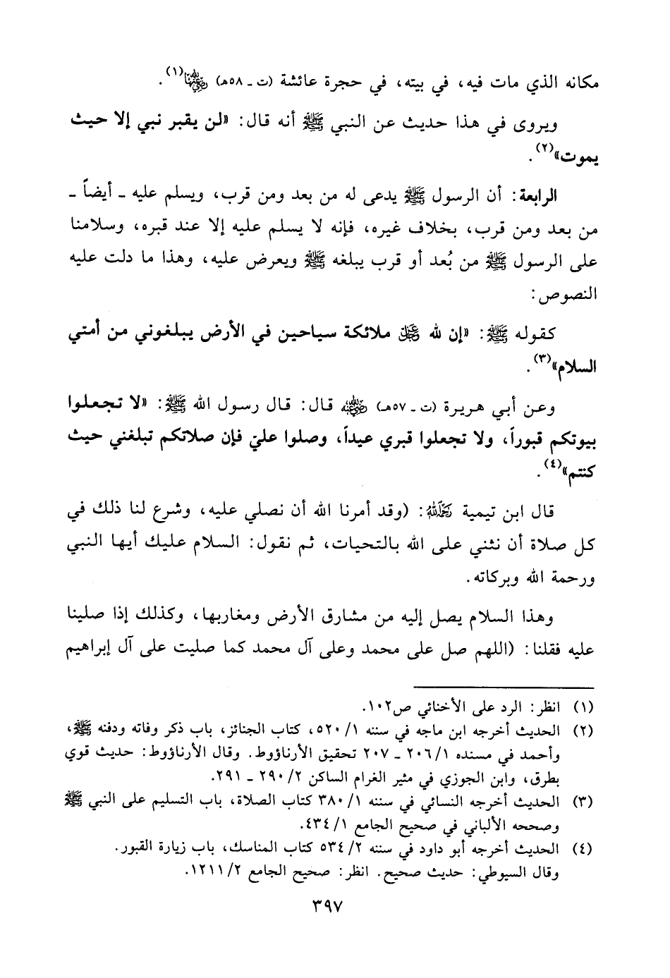 وعن أبي هريرة (ت - 57هـ) رضي الله عنه قال: قال رسول الله صلّى الله عليه وسلّم: «لا تجعلوا بيوتكم قبوراً، ولا تجعلوا قبري عيداً، وصلوا عليّ فإن صلاتكم تبلغني حيث كنتم» (¬4) .