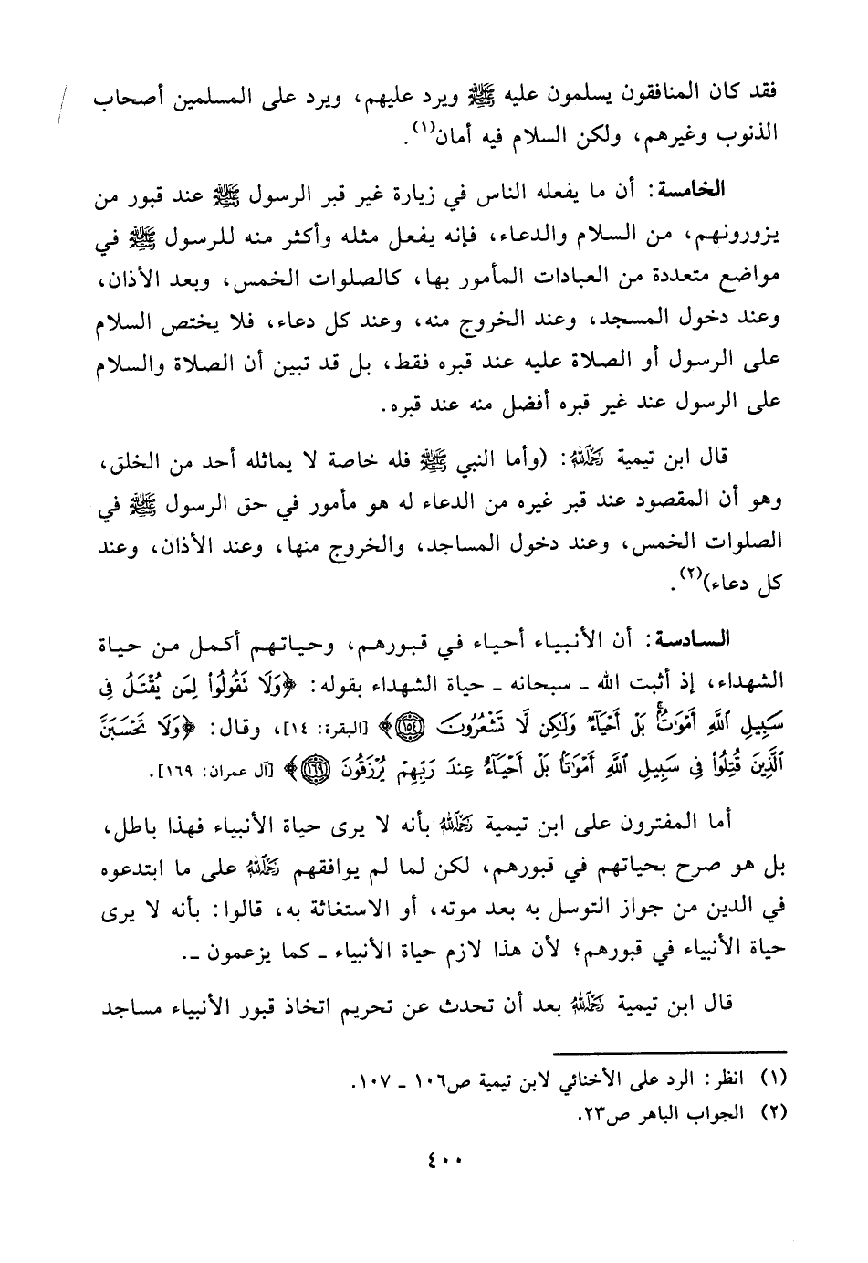 الخامسة: أن ما يفعله الناس في زيارة غير قبر الرسول صلّى الله عليه وسلّم عند قبور من يزورونهم، من السلام والدعاء، فإنه يفعل مثله وأكثر منه للرسول صلّى الله عليه وسلّم في مواضع متعددة من العبادات المأمور بها، كالصلوات الخمس، وبعد الأذان، وعند دخول المسجد، وعند الخروج منه، وعند كل دعاء، فلا يختص السلام على الرسول أو الصلاة عليه عند قبره فقط، بل قد تبين أن الصلاة والسلام على الرسول عند غير قبره أفضل منه عند قبره.