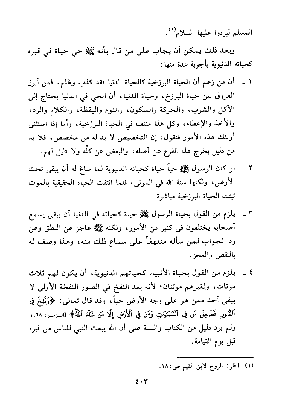 3 - يلزم من القول بحياة الرسول صلّى الله عليه وسلّم حياة كحياته في الدنيا أن يبقى يسمع أصحابه يختلفون في كثير من الأمور، ولكنه صلّى الله عليه وسلّم عاجز عن النطق وعن رد الجواب لمن سأله متلهفاً على سماع ذلك منه، وهذا وصف له بالنقص والعجز.