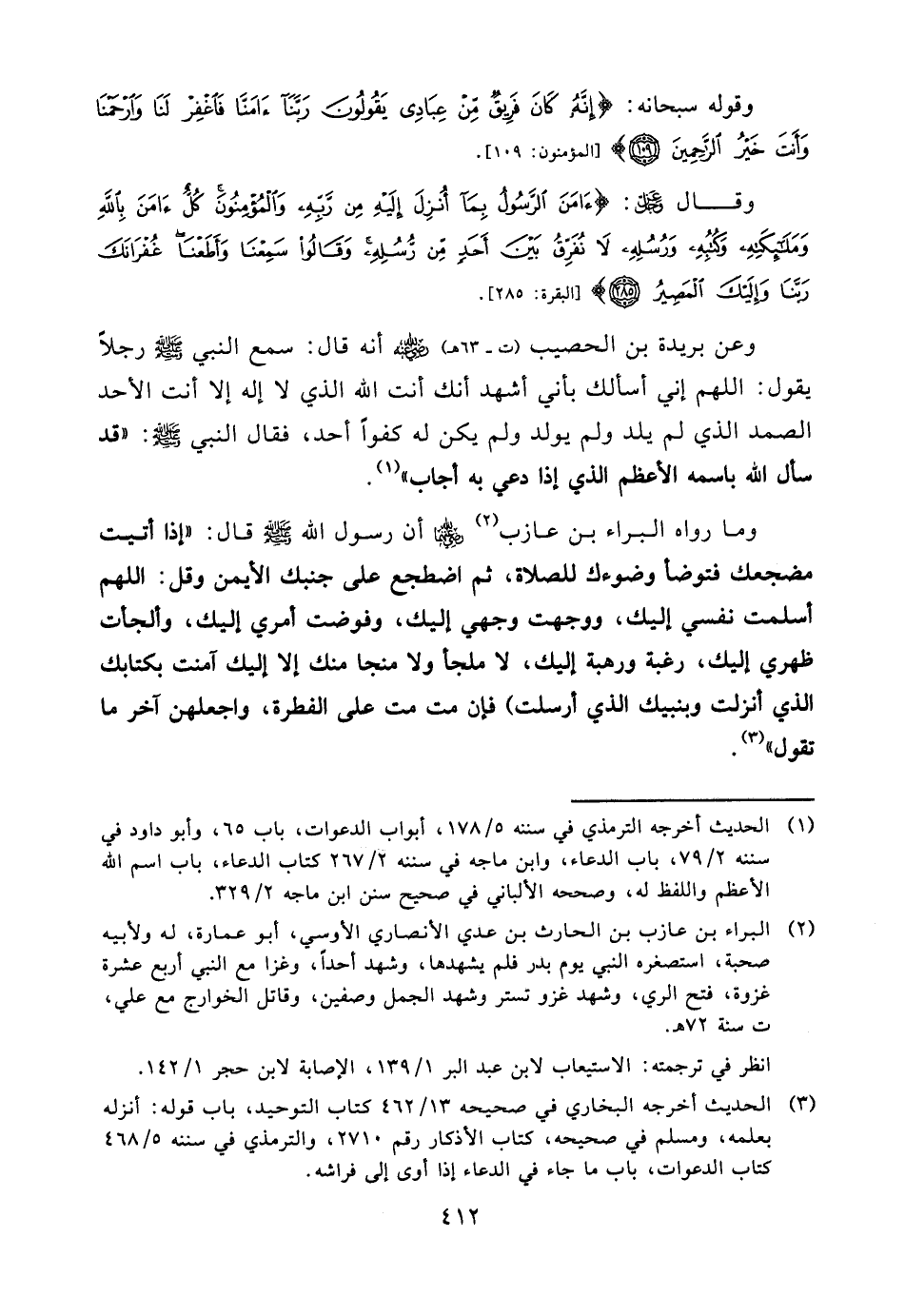 وعن بريدة بن الحصيب (ت - 63هـ) رضي الله عنه أنه قال: سمع النبي صلّى الله عليه وسلّم رجلاً يقول: اللهم إني أسألك بأني أشهد أنك أنت الله الذي لا إله إلا أنت الأحد الصمد الذي لم يلد ولم يولد ولم يكن له كفواً أحد، فقال النبي صلّى الله عليه وسلّم: «قد سأل الله باسمه الأعظم الذي إذا دعي به أجاب» (¬1) .