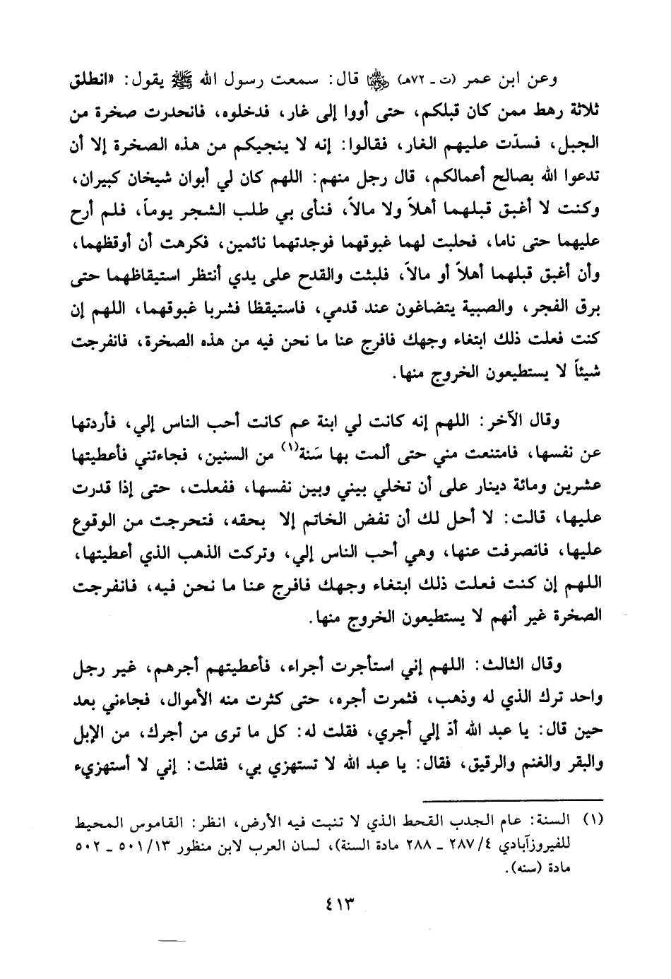 وعن ابن عمر (ت - 72هـ) رضي الله عنهما قال: سمعت رسول الله صلّى الله عليه وسلّم يقول: «انطلق ثلاثة رهط ممن كان قبلكم، حتى أووا إلى غار، فدخلوه، فانحدرت صخرة من الجبل، فسدّت عليهم الغار، فقالوا: إنه لا ينجيكم من هذه الصخرة إلا أن تدعوا الله بصالح أعمالكم، قال رجل منهم: اللهم كان لي أبوان شيخان كبيران، وكنت لا أغبق قبلهما أهلاً ولا مالاً، فنأى بي طلب الشجر يوماً، فلم أرح عليهما حتى ناما، فحلبت لهما غبوقهما فوجدتهما نائمين، فكرهت أن أوقظهما، وأن أغبق قبلهما أهلاً أو مالاً، فلبثت والقدح على يدي أنتظر استيقاظهما حتى برق الفجر، والصبية يتضاغون عند قدمي، فاستيقظا فشربا غبوقهما، اللهم إن كنت فعلت ذلك ابتغاء وجهك فافرج عنا ما نحن فيه من هذه الصخرة، فانفرجت شيئاً لا يستطيعون الخروج منها.