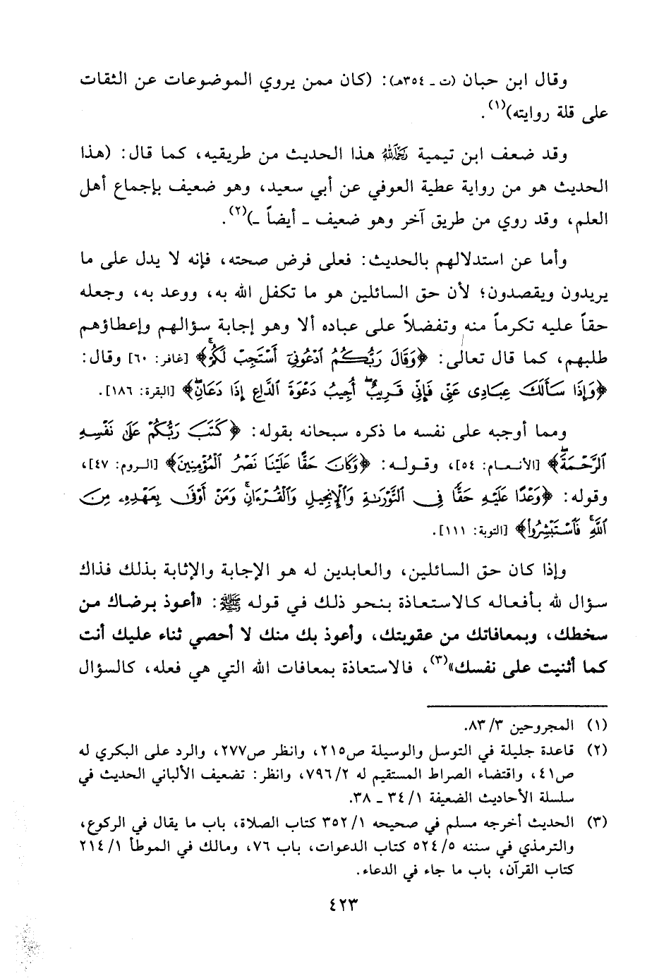 وأما عن استدلالهم بالحديث: فعلى فرض صحته، فإنه لا يدل على ما يريدون ويقصدون؛ لأن حق السائلين هو ما تكفل الله به، ووعد به، وجعله حقاً عليه تكرماً منه وتفضلاً على عباده ألا وهو إجابة سؤالهم وإعطاؤهم طلبهم، كما قال تعالى: {وَقَالَ رَبُّكُمُ ادْعُونِي أَسْتَجِبْ لَكُمْ} [غافر: 60] وقال: {وَإِذَا سَأَلَكَ عِبَادِي عَنِّي فَإِنِّي قَرِيبٌ أُجِيبُ دَعْوَةَ الدَّاعِ إِذَا دَعَانِ} [البقرة: 186] .