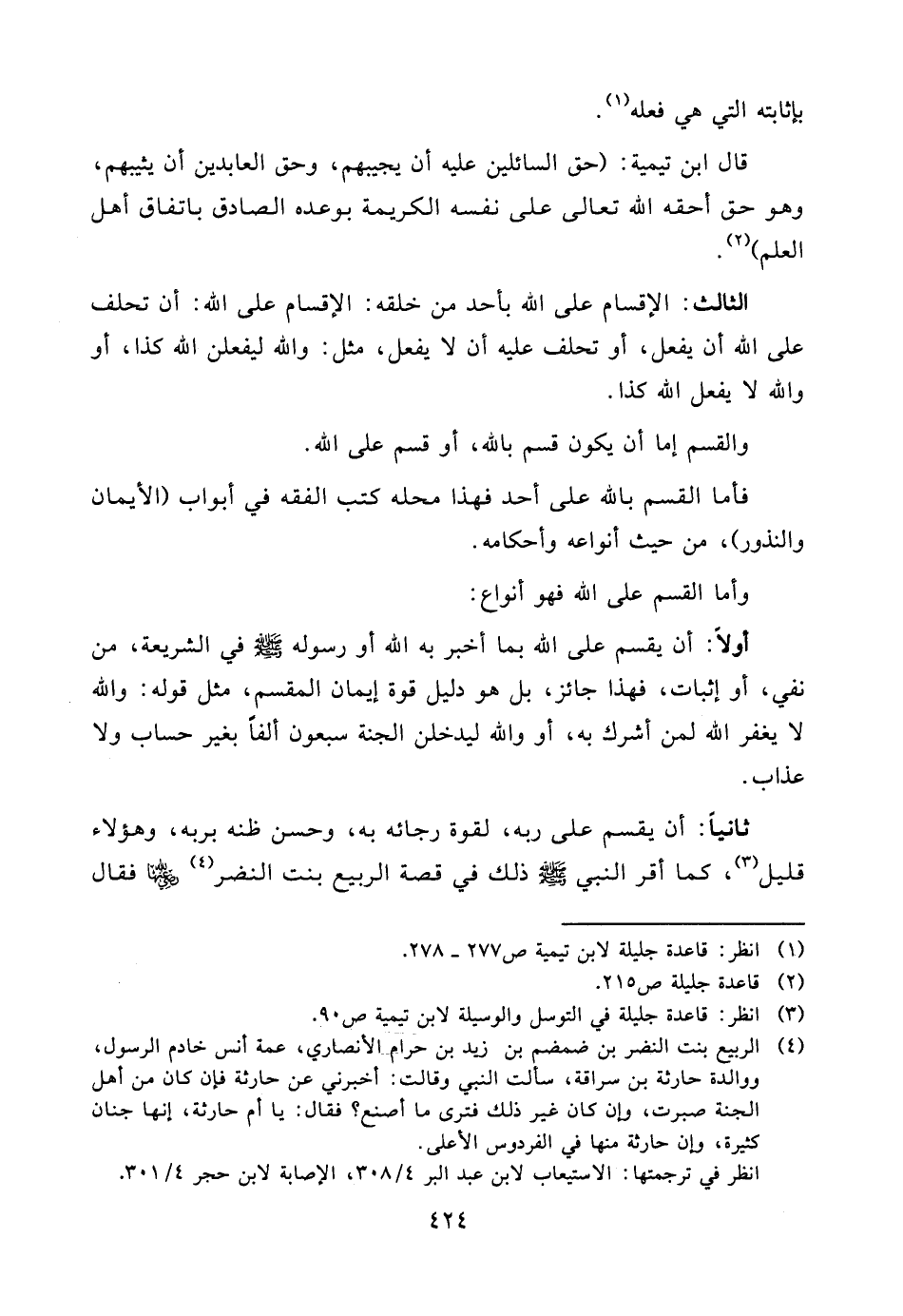 ثانياً: أن يقسم على ربه، لقوة رجائه به، وحسن ظنه بربه، وهؤلاء قليل (¬3) ، كما أقر النبي صلّى الله عليه وسلّم ذلك في قصة الربيع بنت النضر (¬4) رضي الله عنها فقال