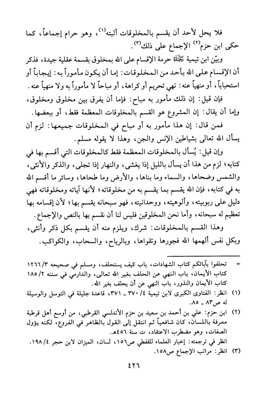 فلا يحل لأحد أن يقسم بالمخلوقات ألبته (¬1) ، وهو حرام إجماعاً، كما حكى ابن حزم (¬2) الإجماع على ذلك (¬3) .