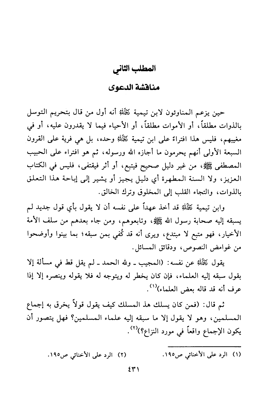 ثم قال: (فمن كان يسلك هذ المسلك كيف يقول قولاً يخرق به إجماع المسلمين، وهو لا يقول إلا ما سبقه إليه علماء المسلمين؟ فهل يتصور أن يكون الإجماع واقعاً في مورد النزاع؟) (¬2) .