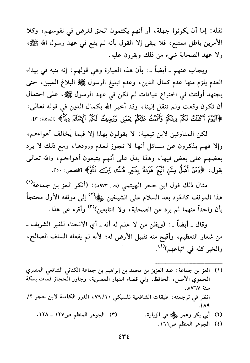 مثال ذلك قول ابن حجر الهيتمي (ت - 973هـ) : (أنكر العز بن جماعة (¬1) هذا الموقف كالعَود بعد السلام على الشيخين رضي الله عنهما (¬2) إلى موقفه الأول محتجاً بأن واحداً منهما لم يرد عن الصحابة، ولا التابعين) (¬3) وأقره عى هذا.