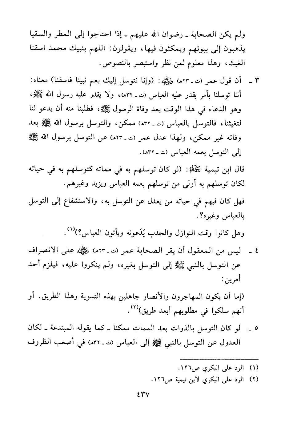 5 - لو كان التوسل بالذوات بعد الممات ممكنا - كما يقوله المبتدعة - لكان العدول عن التوسل بالنبي صلّى الله عليه وسلّم إلى العباس (ت - 32هـ) في أصعب الظروف
