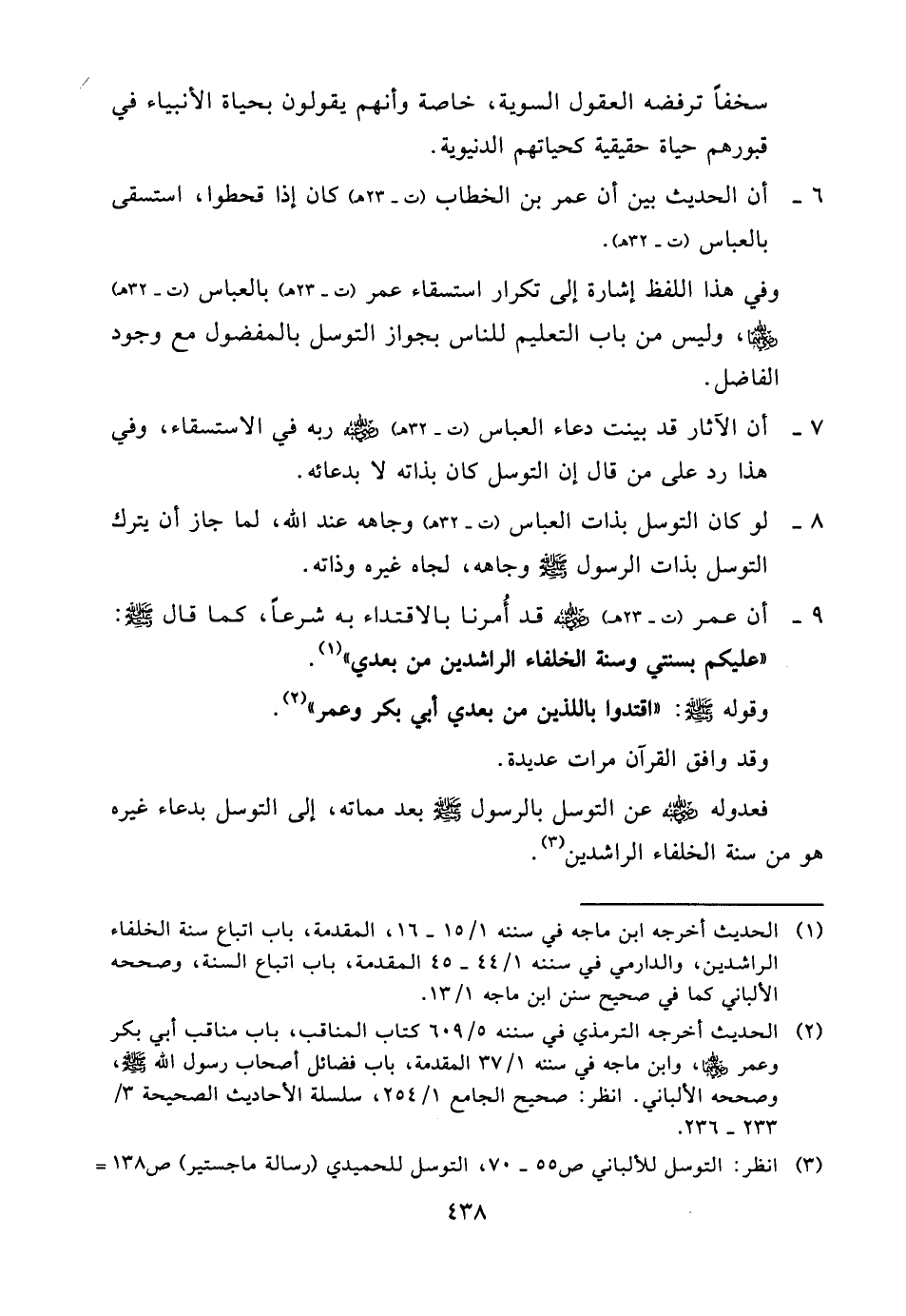 (¬3) انظر: التوسل للألباني ص55 - 70، التوسل للحميدي (رسالة ماجستير) ص138 - 148، وانظر: الرد على البكري لابن تيمية ص124، 233، اقتضاء الصراط المستقيم له 2/684.
