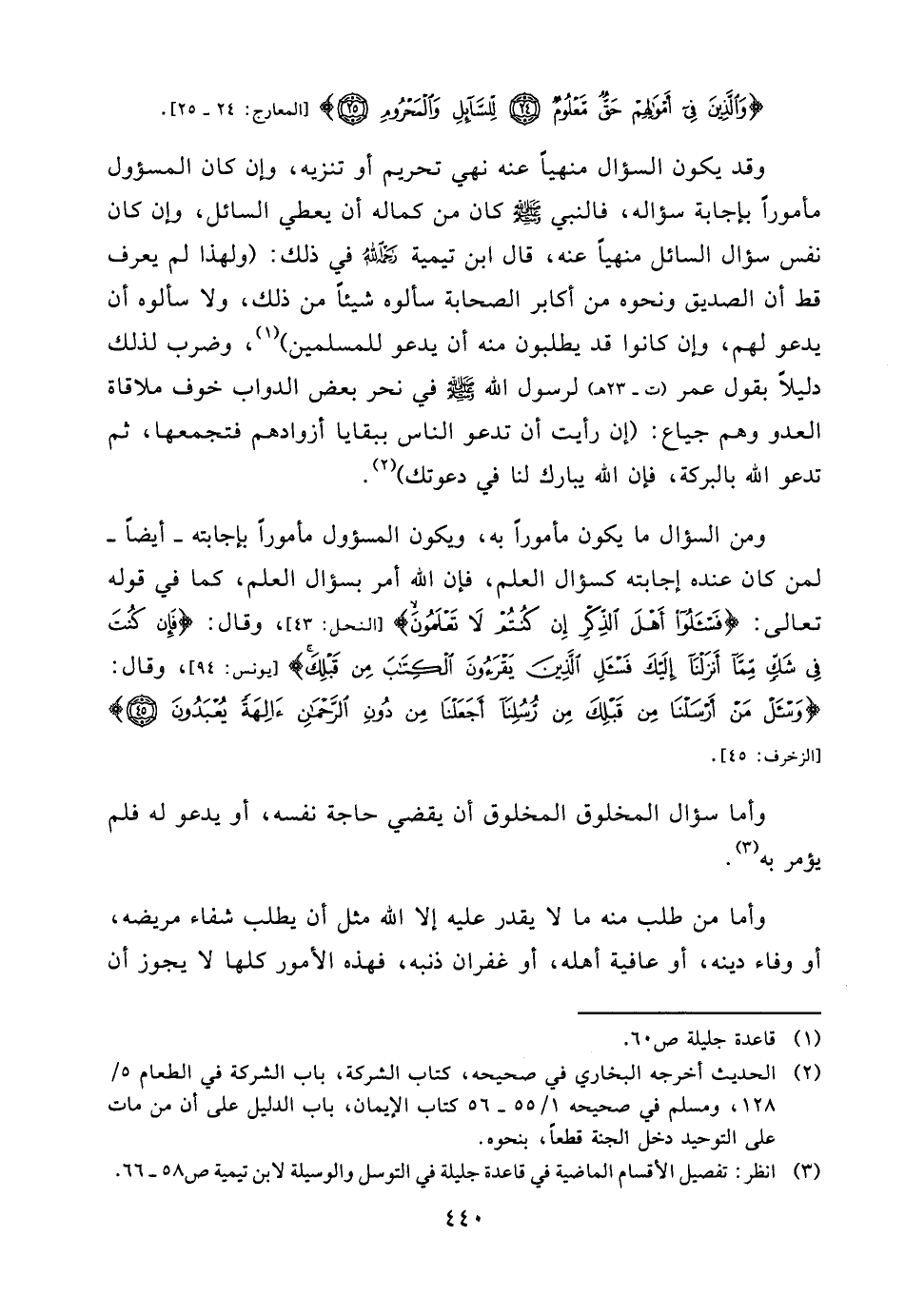 ومن السؤال ما يكون مأموراً به، ويكون المسؤول مأموراً بإجابته - أيضاً - لمن كان عنده إجابته كسؤال العلم، فإن الله أمر بسؤال العلم، كما في قوله تعالى: {فَاسْأَلوا أَهْلَ الذِّكْرِ إِنْ كُنْتُمْ لا تَعْلَمُونَ} [النحل: 43] ، وقال: {فَإِنْ كُنْتَ فِي شَكٍّ مِمَّا أَنْزَلْنَا إِلَيْكَ فَاسْأَلِ الَّذِينَ يَقْرَأُونَ الْكِتَابَ مِنْ قَبْلِكَ} [يونس: 94] ، وقال: {وَاسْأَلْ مَنْ أَرْسَلْنَا مِنْ قَبْلِكَ مِنْ رُسُلِنَا أَجَعَلْنَا مِنْ دُونِ الرَّحْمَنِ آلِهَةً يُعْبَدُونَ} [الزخرف: 45] .
